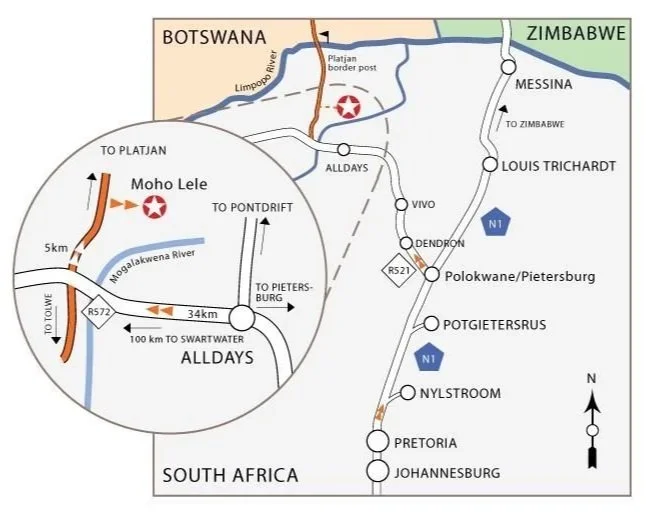 3. Ta av fra N1 rett før Polokwane og følg R521 mot Kalbank - Dendron - Vivo - Alldays, IKKE mot Seshego